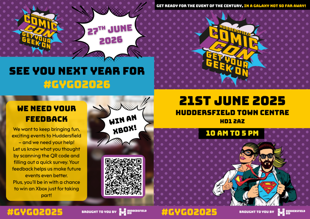 Save the date – Saturday, 21st June 2025 – and join us in Huddersfield Town Centre for a free celebration of all things geek, open to everyone.